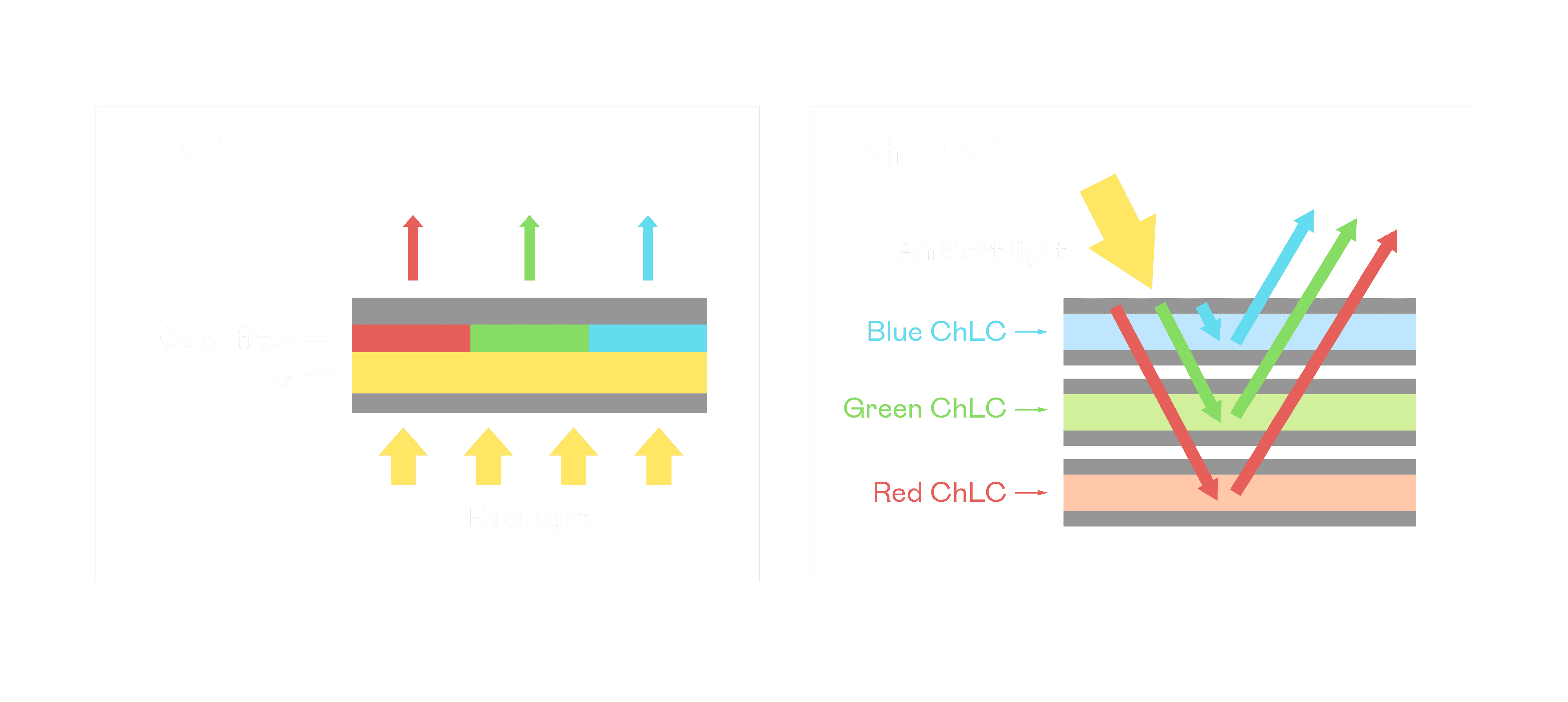 ChLCD 胆固醇液晶就如同纸张一样,,,透过反射环境光来显示影像,,因此长时间观看不易造成人眼视觉疲劳,,可达到护眼效果。。当处于户外阳光下使用,,,LCD 影像容易失真而不易观看,,但胆固醇液晶仍可维持较佳的影像品质。。。