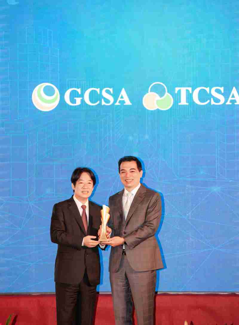 达全方位永续表现获全球永续奖及台湾永续奖肯定,,,,由副总统赖清德颁奖 (左),,,888.BY集团电子游戏总经理柯富仁 (右) 代表领奖
