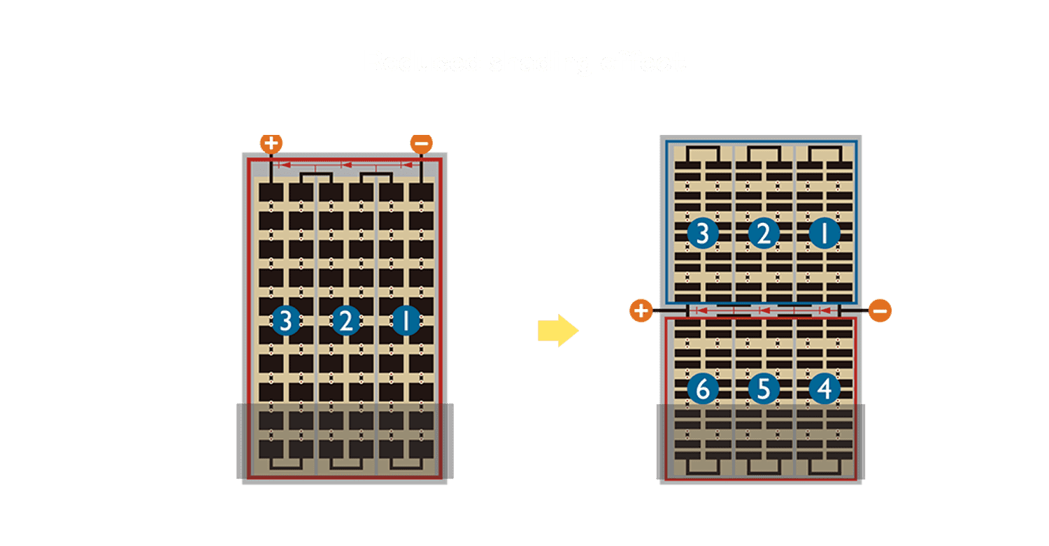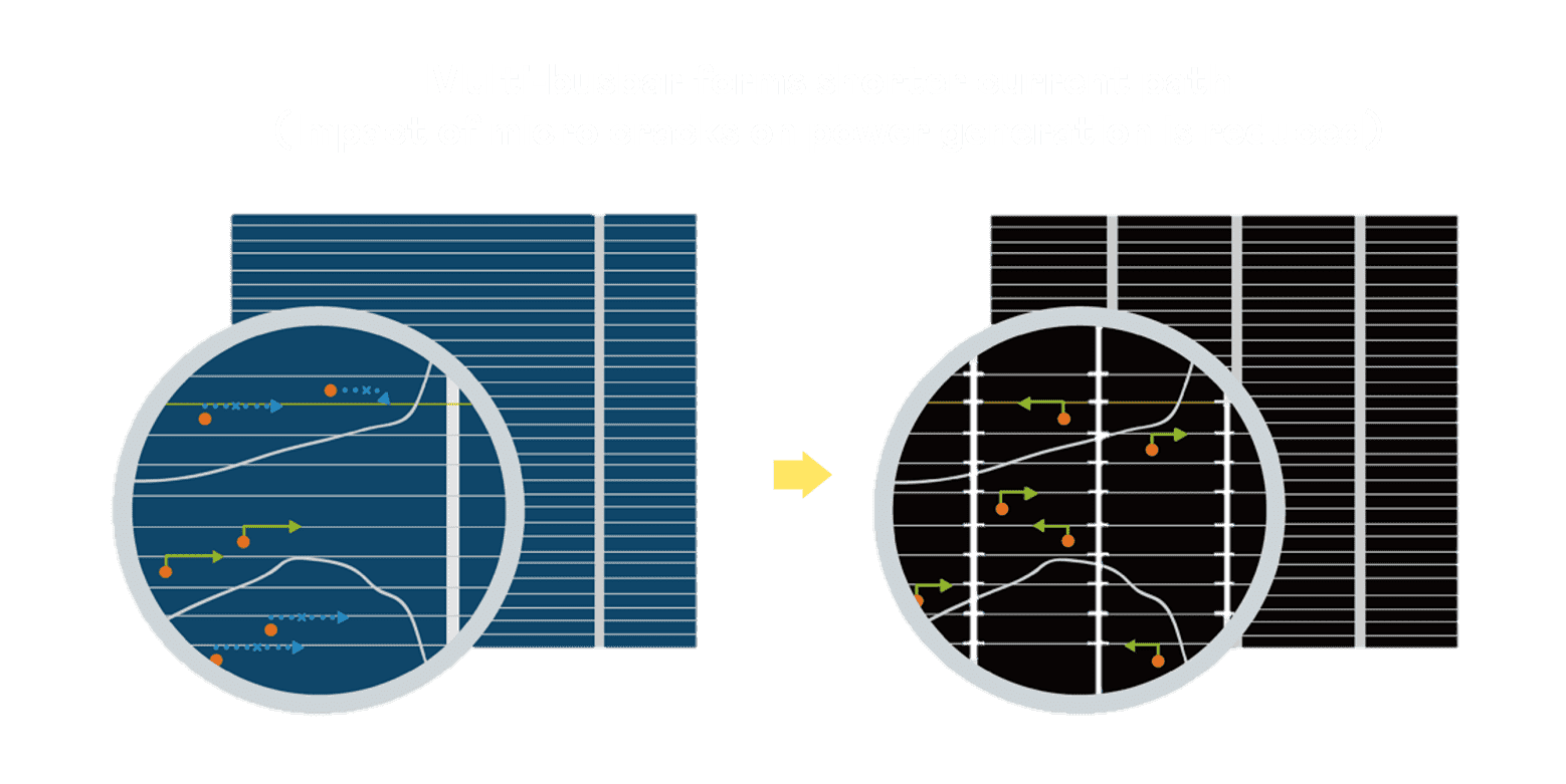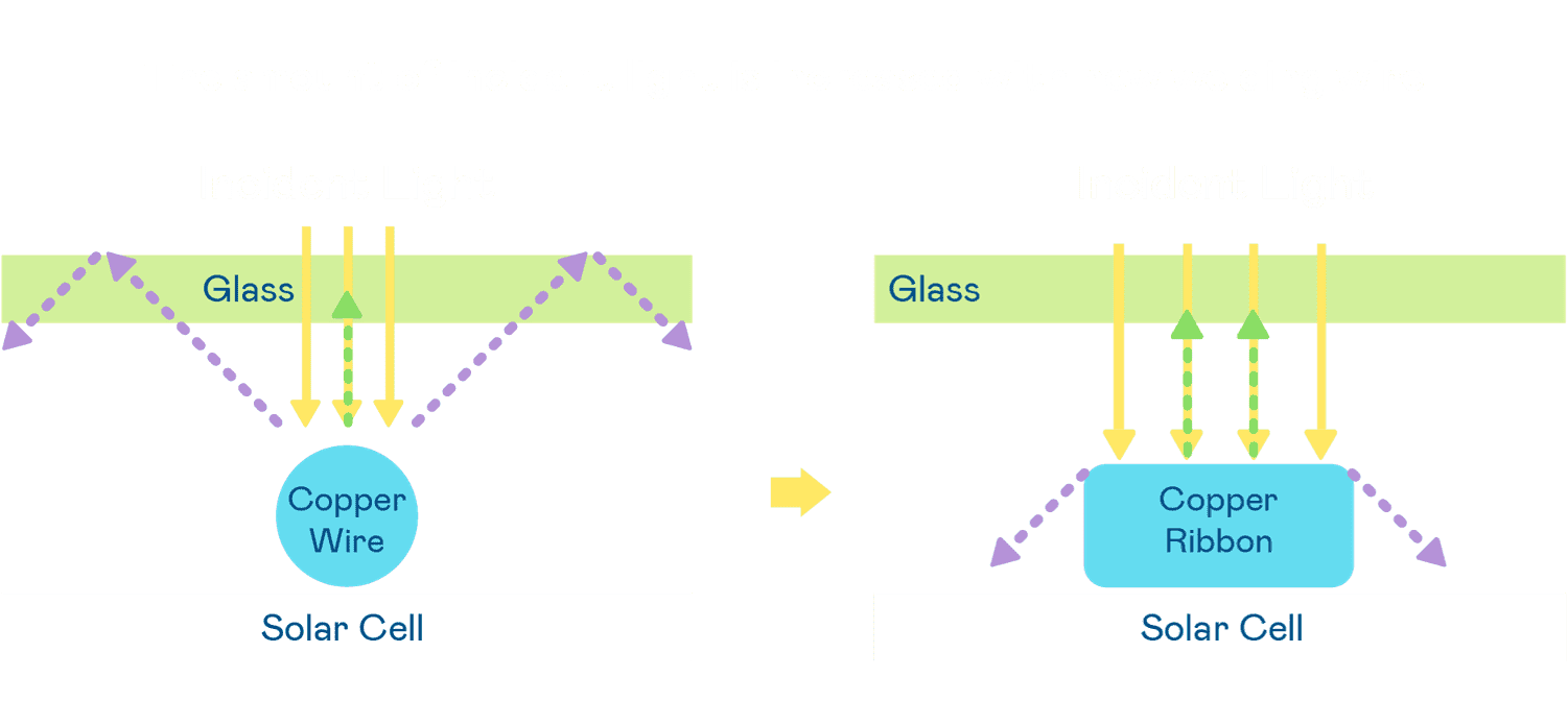- 电池使用多条铜导线 (Copper wire) 于电池片上形成较短的电流路径,,,提高电流收集效率,,,采用圆形设计的铜导线较传统扁平式的铜焊带 (Ribbon),,可增加入射至电池的光线量。。。